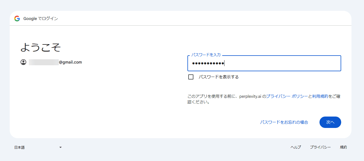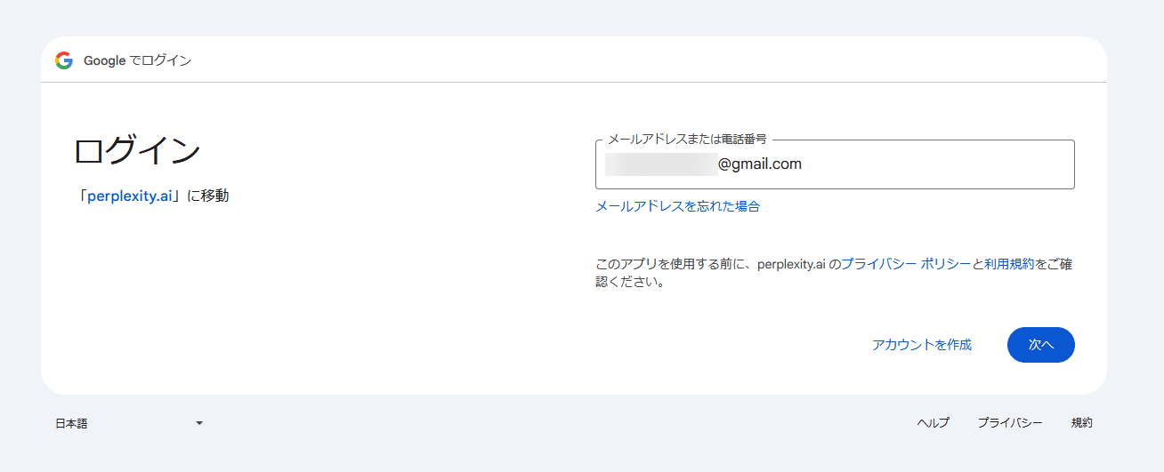- Google アカウントを選択すると、次のようなのログイン画面が表示されます。
