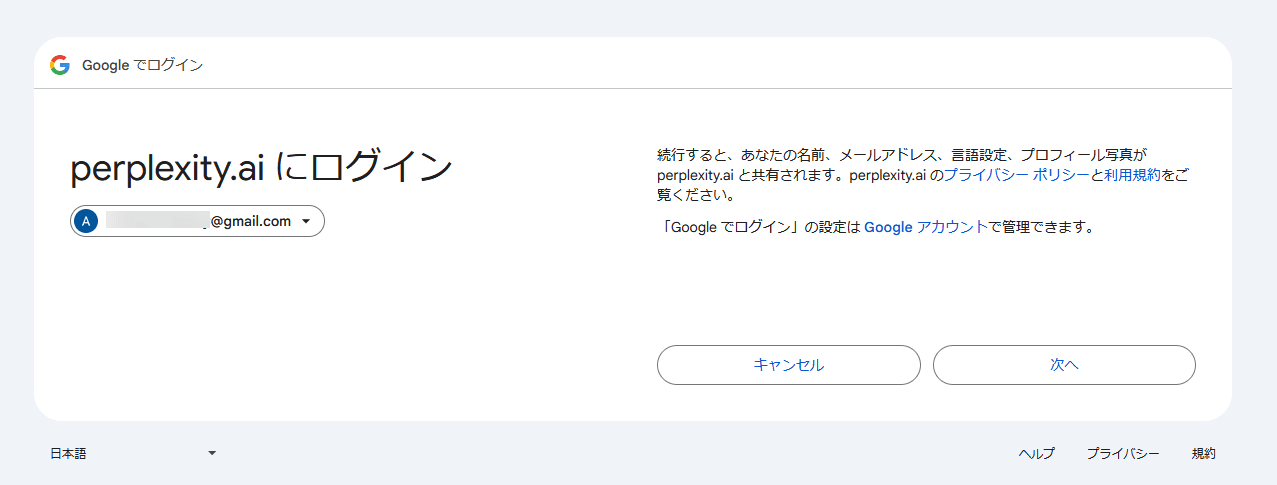 1.「Googleで続ける」をクリックすると、Googleログインのポップアップが表示されます